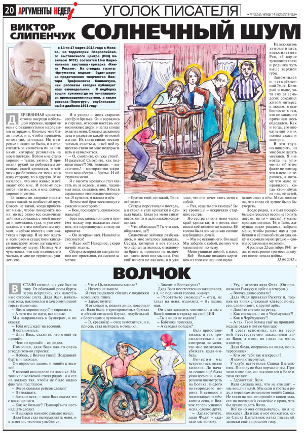 АРГУМЕНТЫ НЕДЕЛI, № 10 (352), рассказы «Солнечный шум», «Волчок», «Перегруз», «Флажок», 14 марта 2013 года