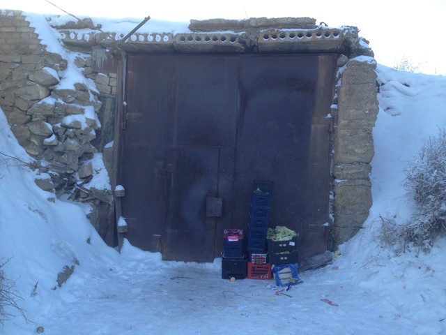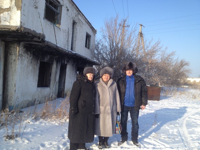 Виктор Слипенчук, Алма Кульниязова (журналист) и Виктор Кадык (предприниматель) на фоне овощехранилища, построенного заключенными. Действует и поныне.